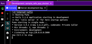 Rails -> Development: sample_rails_app_docker を選択肢、画面下部の “docker-compose” が “docker-compose exec” になっている事を確認します: