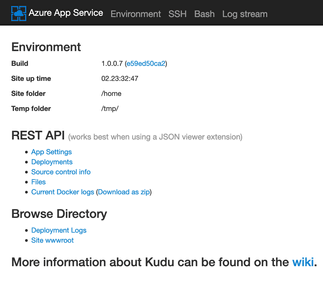 Kudu の画面上部にある「SSH」リンクをクリックすると、ブラウザ上でコンテナ内の SSH サーバーに接続出来ます。SSH で接続した後は、特別なことはないので、ログファイルを確認したりしてください。