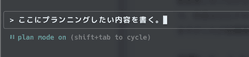 Claude Code では Shift + TAB を押すと Plan mode と言うモードに入る事ができます。ここでもプロンプトを入力するんですが、一旦それを鑑みて必要に応じてコードベースの探索などを行いながら、具体的にどの様な作業をするかプランニングしてまとめ、計画を表示してくれます。その内容に問題がなければ Go を出せば作業が始まるし、ツッコミどころがあればプロンプトを追加します。