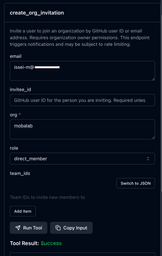 実装した “create_org_invitation” が確認できます。これを早速実行してみましょう。一覧からこれをクリックします。そうすると右側にフォームが出てくるので、必要な情報を入れて Submit してみます。email または invitee_id(GitHub User ID)のいずれかは必須になります。今回は email を使って mobalab org に招待したいと思います。値を入れて “Run Tool” を実行します。